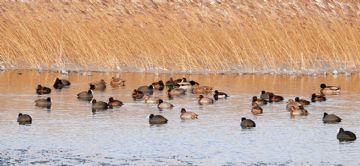 In de winter is de Volgermeer een aangename plek voor veel soorten eenden. Op deze foto de wilde eend, krakeend, tafeleend en kuifeend. Daarnaast de meerkoet en – goed verstopt- een kleine futensoort, de dodaar. Alle vogelsoorten op deze foto broeden ook in de Volgermeer.